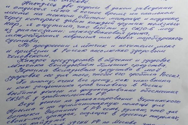 Украинская летчица Надежда Савченко, обвиняемая якобы в причастности к гибели двух российских журналистов на востоке Украины, написала обращение к российскому омбудсмену Элле Памфиловой. Об этом сообщил адвокат Савченко Николай Полозов.
