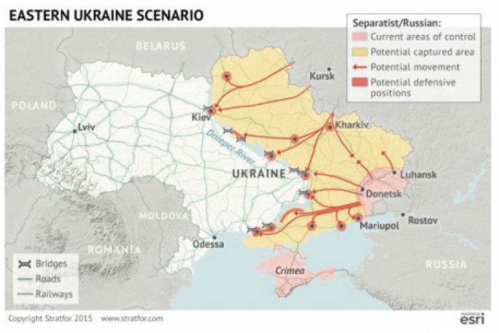 "От 40 до 60 тыс. военнослужащих для продвижения вглубь Украины на 645 км и захвата территории площадью в 103,600 кв. км. Это займет от 23 до 28 дней. Для обороны территории потребуется от 80 до 112 тыс. военных. А для контроля над местным населением численностью 6 млн человек — от 13,2 до 120 тыс. солдат. При этом не стоит забывать и о сложностях в пересечении большой реки (Днепра. — ред.)", — говорится в документе Stratfor.