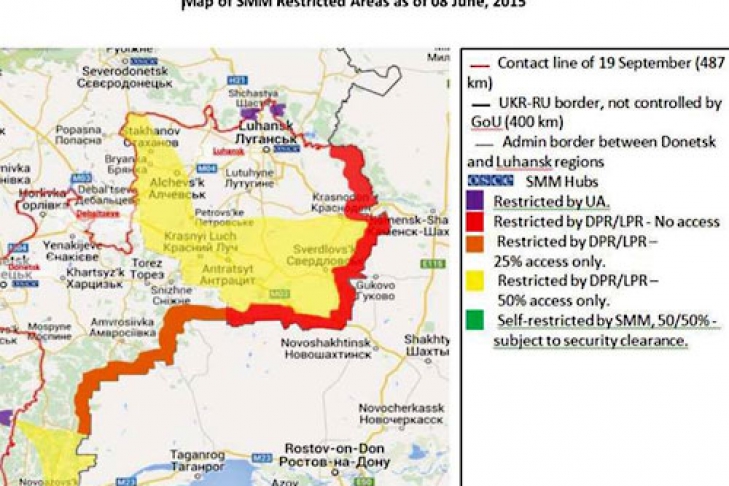 "Карта - это зоны, куда не имеют доступа наблюдатели ОБСЕ. Фиолетовая зона - украинские силы ограничивают доступ, красная зона - террористические организации ДНР/ЛНР не дают никакого доступа, оранжевая зона - террористические организации ДНР/ЛНР дают 25% доступа, желтая зона - террористические организации ДНР/ЛНР дают 50% доступа, зеленая зона - добровольное самоограничение 50/50 наблюдателей по соображениям безопасности", - объяснил источник.