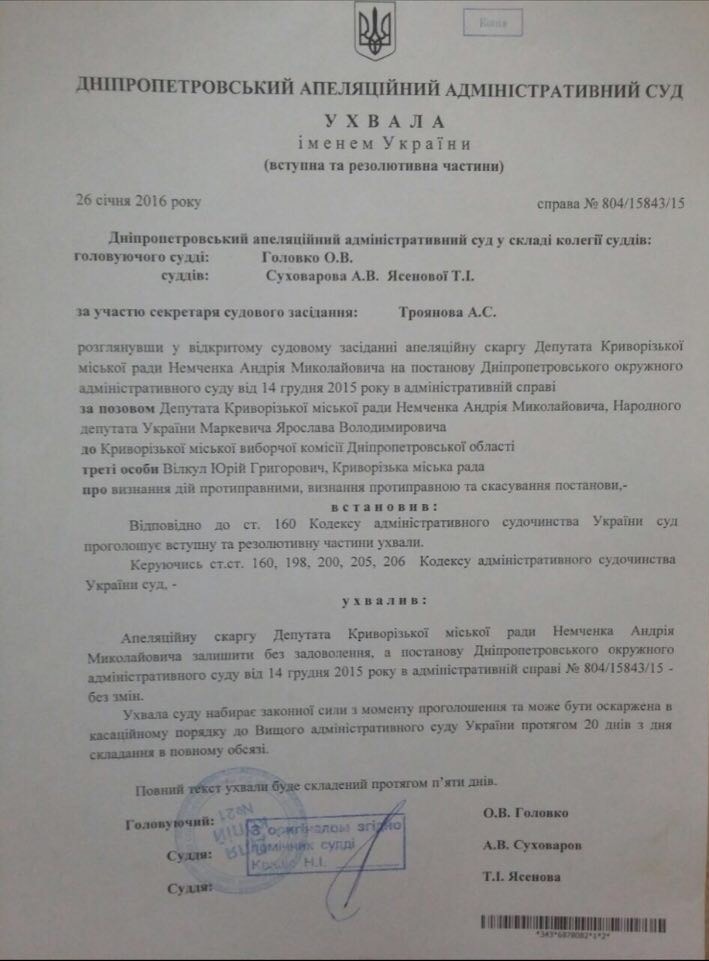 Днепропетровский административный апелляционный суд своим решением отклонил жалобу депутата горсовета от партии «Силы людей» и признал, что первая сессия Криворожского горсовета VII созыва, на которой действующий городской голова Юрий Вилкул вступил в должность, была полностью законной. До этого законной сессию признал суд первой инстанции.