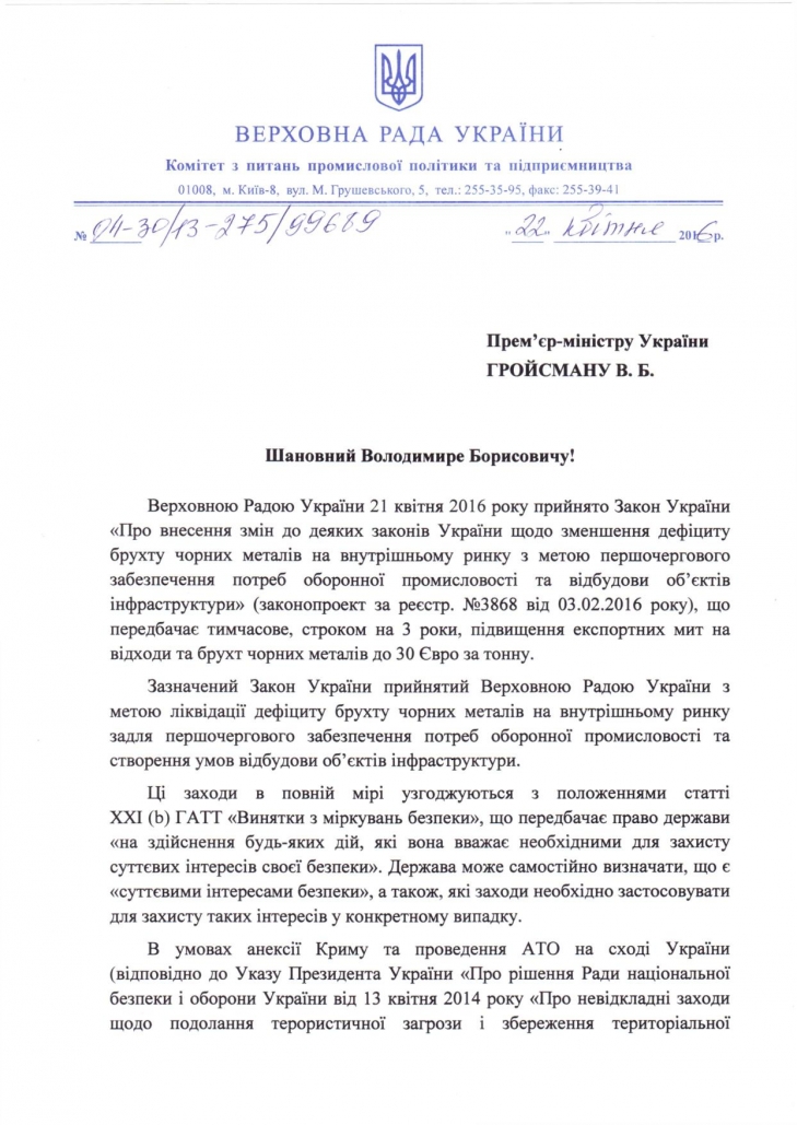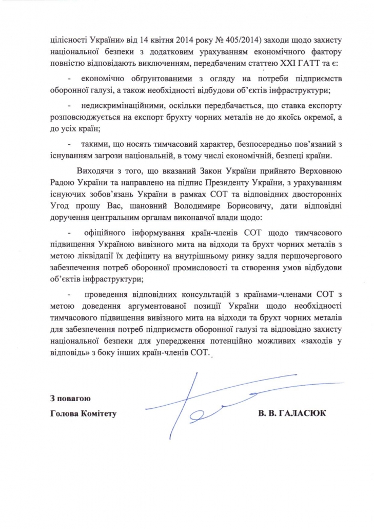 «Закон принят с целью ликвидации дефицита лома черных металлов на внутреннем рынке для первоочередного обеспечения потребностей оборонной промышленности и создания условий для восстановления объектов инфраструктуры, - говорится в письме Виктора Галасюк к Владимиру Гройсману.