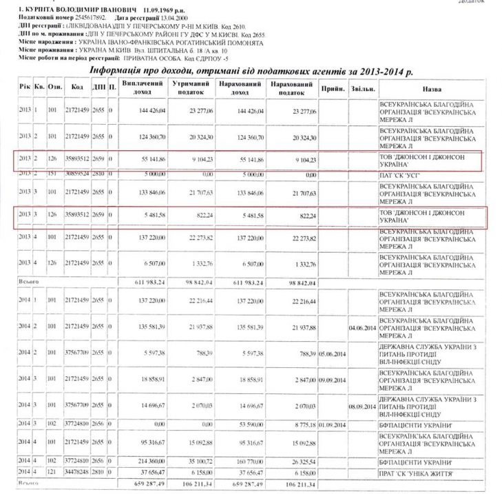 А тепер пропоную ознайомитись з даними про рух коштів по рахунку самого Володимира Івановича Курпіти за 2013 рік – незадовго перед тим, як Курпіта очолив Державну службу України з питань протидії ВІЛ-інфекції/СНІДу та інших соціально небезпечних захворювань. У червоній рамочці – надходження від ТОВ «Джонсон і Джонсон Україна», тобто фірми, головна компанія якої є власником виробництва препарату «Презиста».
