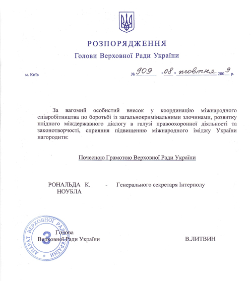 «Я, как Генерал-лейтенант милиции, в прошлом учасник боевых действий гражданской полиции ООН, испытываю чувство гордости за возложенную на меня ответственность Парламентом Украины вручить Господину Рональду Ноублу, Генеральному Секретарю INTERPOL, Почетную Грамоту от имени Парламента Украины. Разрешите пожелать Вам реализации Ваших инициатив и глобальной миссии INTERPOL».