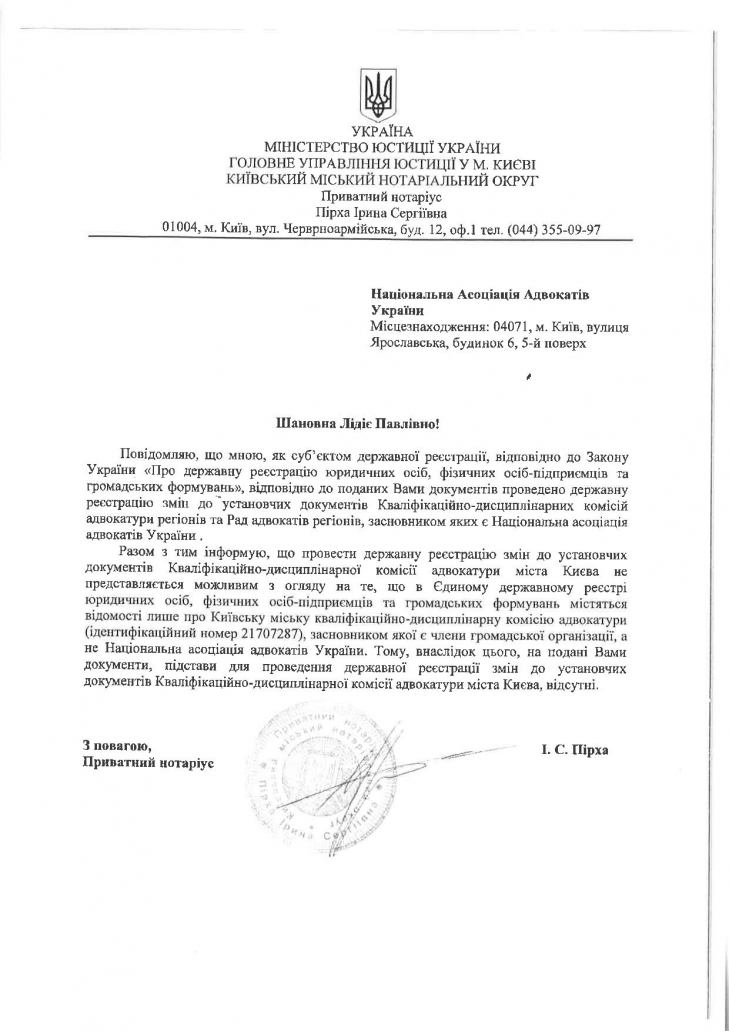 «Согласно закону "Об адвокатуре и адвокатской деятельности", решения САУ, принятые в предусмотренном законе порядке, является обязательным для исполнения другими органами адвокатского самоуправления. Поэтому и решение Совета адвокатов Украины, направленные на создание в г. Киеве легитиминого органа - квалификационно-дисциплинирнои комиссии адвокатуры м. Киева, должны быть выполнены в сроки, которые для этого установлены.