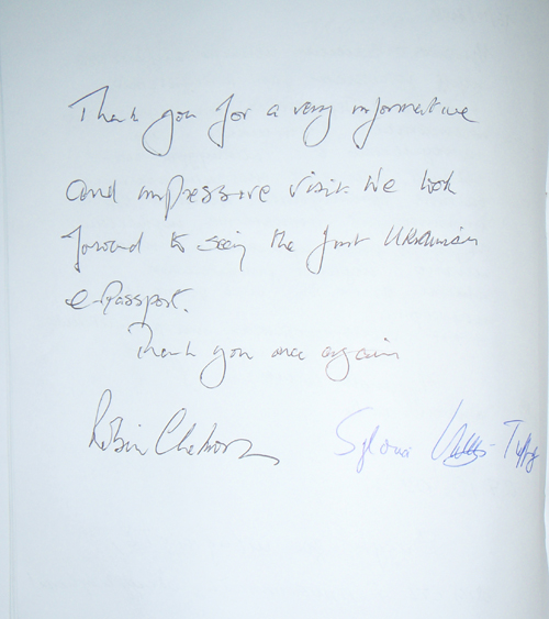 Отзыв Робина Чалмберса, оставленный в книге отзывов Межрегионального центра: "Благодарю за очень содержательный и впечатляющий визит. Ждем увидеть украинский электронный паспорт. Еще раз спасибо!"