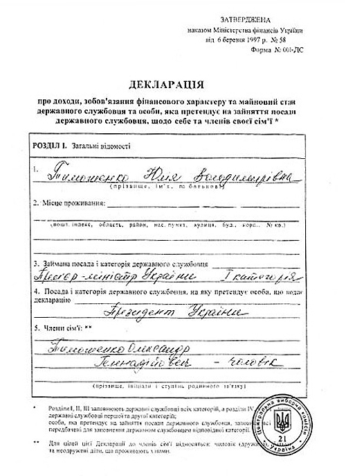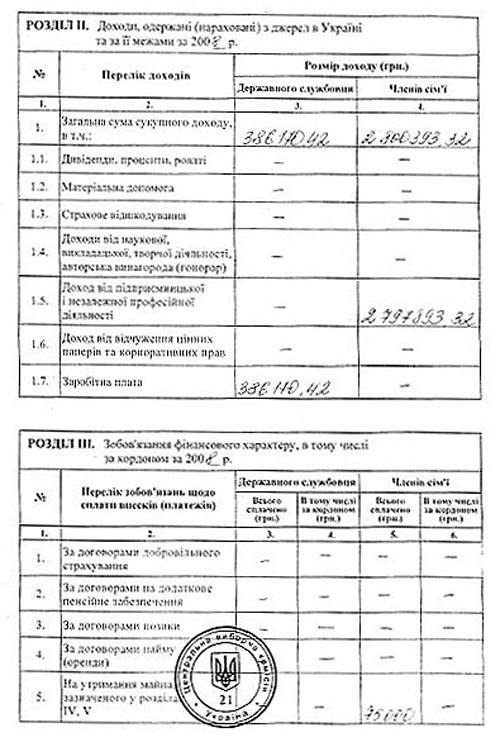 Также весьма сомнительно, чтобы на такой образ жизни Тимошенко хватило даже доходов ее мужа Александра (см копию декларации ниже). Тем более что внятно сообщить избирателям, чем же занимается ее муж-бизнесмен, премьер-министр до сих пор не смогла.