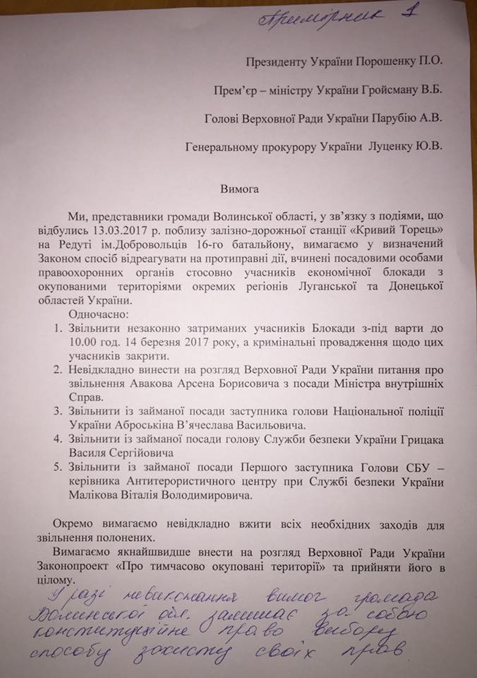 "Освободить незаконно задержанных участников блокады из-под стражи до 10:00 14 марта 2017 года, а криминальные производства против них закрыть", - говориться в требовании.