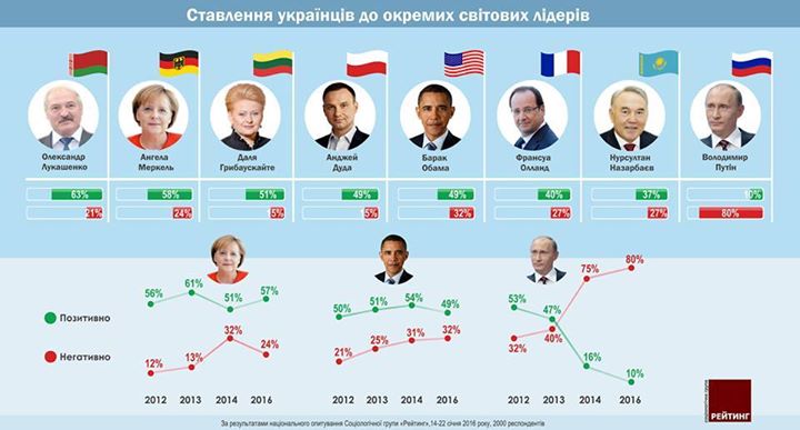 А вот в антирейтинге уверенную победу одержал президент РФ Владимир Путин. 80% украинцев без колебаний заявили о негативном отношении к этому политику.