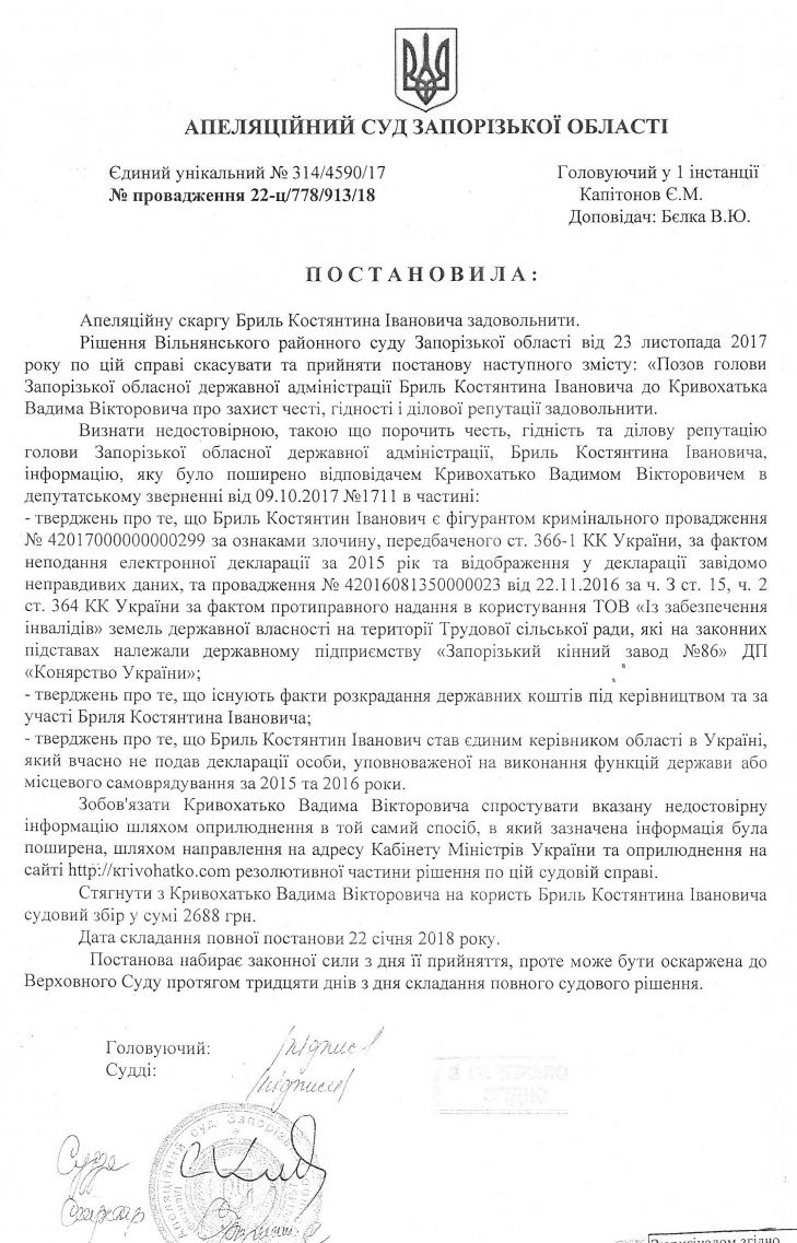 Постановлением Апелляционного суда Запорожской области удовлетворена апелляционная жалоба председателя Запорожской облгосадминистрации Брыля К.И. и отменено решение Вольнянского районного суда Запорожской области (от 23.11.2017). И полностью удовлетворен иск к Вадиму Викторовичу Кривохатько о защите чести, достоинства и деловой репутации. Постановлением суда признаны недостоверными сведения, распространенные Кривохатько В.В. в депутатском обращении к Премьер-министру Украины Владимиру Гройсману в части: