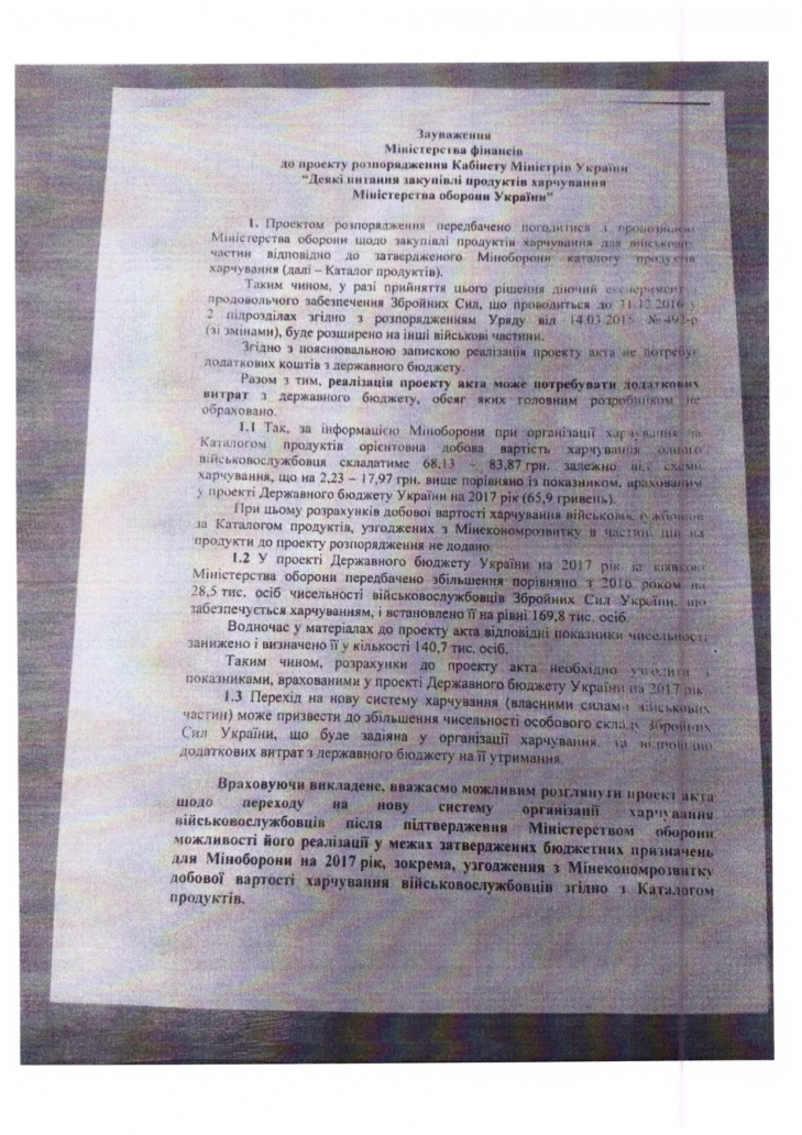 Горе-реформаторов не смутил даже недвусмысленный вывод: “Счтимаем воозможным рассмотреть проект акта по переходу на новую систему организации питания военнослужащих лишь после подтверждения МО Украины возможностей его реализации в пределах утвержденных бюджетных назначений для Минобороны на 2017 год, в частности, согласования с Минэкономразвития суточной стоимости питания военнослужащих согласно Каталогу продуктов”.