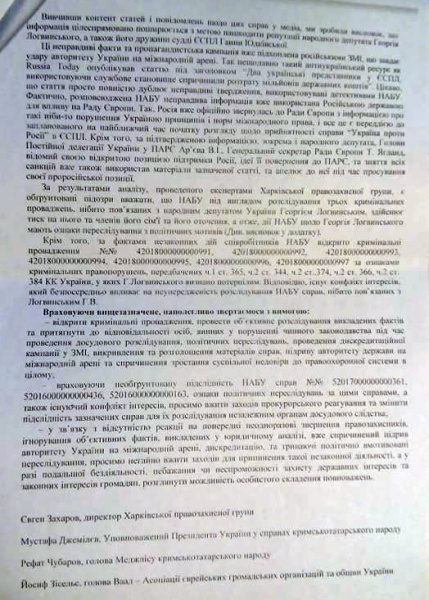 Обращение подписали директор Харьковской правозащитной группы Евгений Захаров, уполномоченный президента по делам крымскотатрского народа Мустафа Джемилев, глава Меджлиса крымскотатарского народа Рефат Чубаров и глава Ваад-Ассоциации еврейских общественных организаций и общин Украины Иосиф Зисельс.