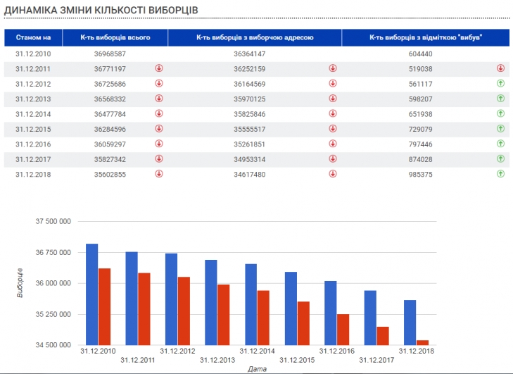 На офіційному веб-сайті Державного реєстру виборців з'явилася зведена таблиця кількості виборців за 2010 – 2018 роки станом на 31 грудня кожного року.