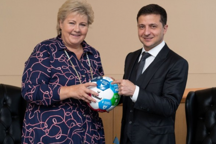 Кроме того, Зеленский сообщил Премьер-министру Норвегии о ситуации на Донбассе. В конце встречи Солберг подарила Главе государства футбольный мяч, на котором изображены Цели устойчивого развития.
