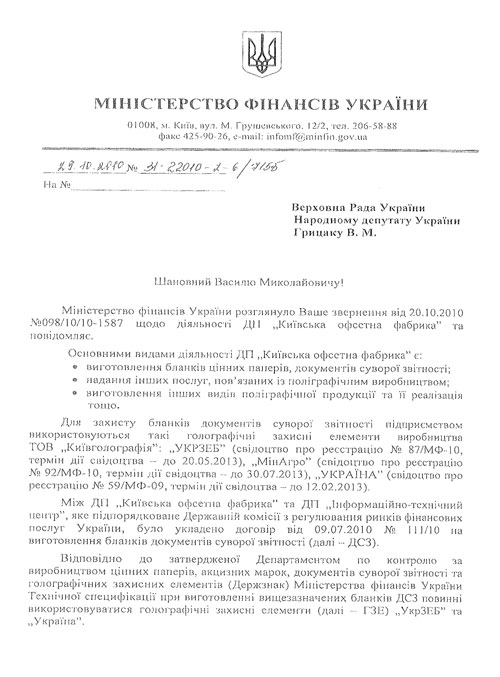 Если Якубович признает себя лоббистом «Киевголографии», то Михаил Бродский пытается это отрицать. Хотя факты говорят об обратном. В каждом своем интервью на тему «голограммы – это зло», глава Госкомпредпринимательства говорит примерно следующее: «заказы на производство документов строгой отчетности идут на коммерческую фирму, а государственное предприятие «Киевская офсетная фабрика» заказов не получает». Лжет Бродский. Вот вам информация о деятельности ГП «Киевская офсетная фабрика» (см. фото).