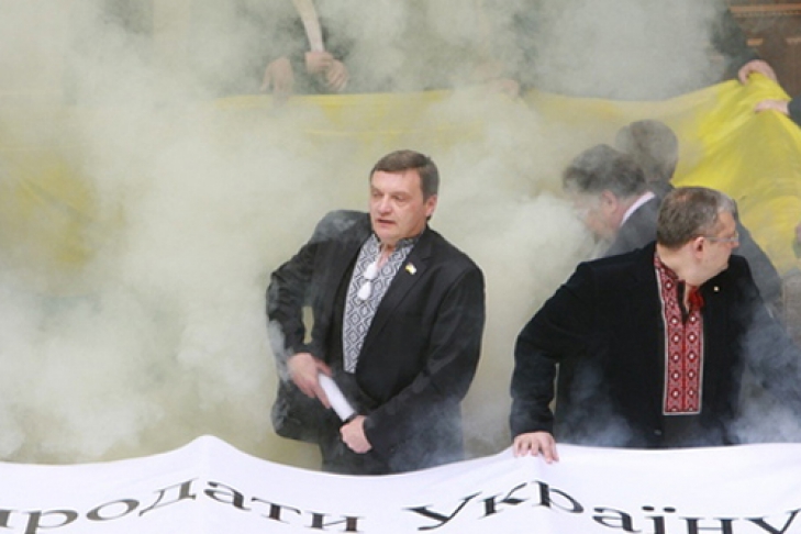 В качестве примера нардеп совершенно неожиданно для нас привел скандальное заседание парламента 27 апреля 2010 года, на котором оппозиция (в том числе Грымчак) устроила массовое побоище с яйцами и дымовыми шашками, протестуя против ратификации соглашения относительно размещения Черноморского флота в Крыму.