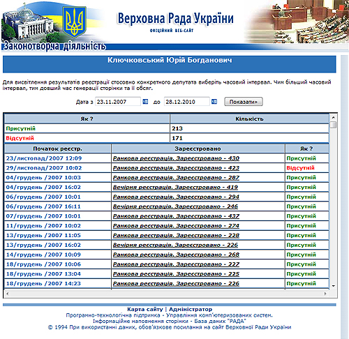 Судя по эмоциям, фонтанировавшим в разговоре с журналистами, Юрия Ключковского очень задело, что его включили в рейтинг депутатов, отсутствующих в парламенте. Безусловно, он, возможно, имеет право так реагировать – ведь Ключковский является автором 549-ти законопроектов. И, кстати, в разговоре с журналистами Ключковский не преминул напомнить об этом, мол, «зайдите на сайт Верховной Рады и посмотрите, я работаю в парламенте!». Журналисты ИАНП зашли и посмотрели. Действительно, согласно официальной статистике ВР Ключковский является автором (или соавтором) 549-ти законопроектов. Браво! Но точно также на сайте ВР, на официальной страничке народного депутата Ключковского Юрия Богдановича, если нажать опцию «Регистрация депутата» высветится точно такая же официальная статистика в период с 23.11.07г. по 28.12.10г.: «присутствует – 213, отсутствует – 171». (см. скан страницы).