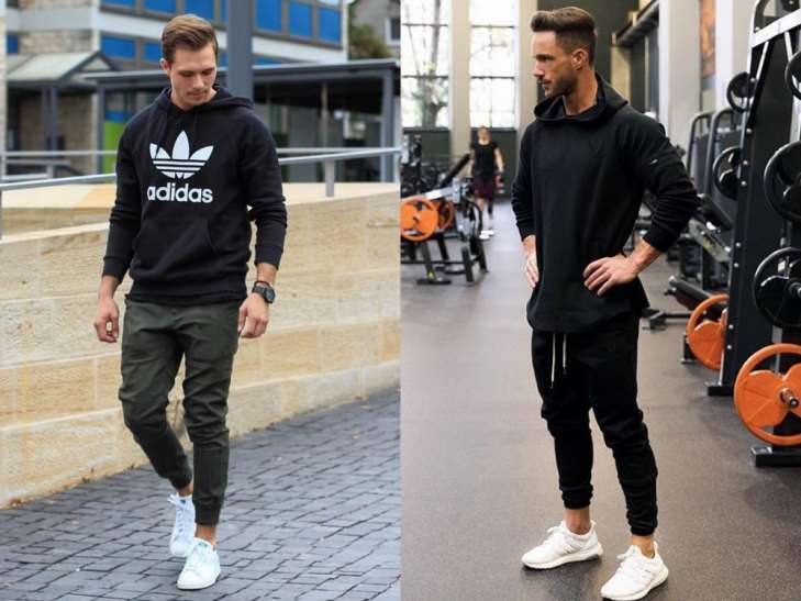 А вот обувь позволяет разбавить монохромный спортивный образ. С зауженными штанами и футболкой отлично сочетаются белые кеды и кроссовки. Но можно выбрать и броские массивные сникерсы.