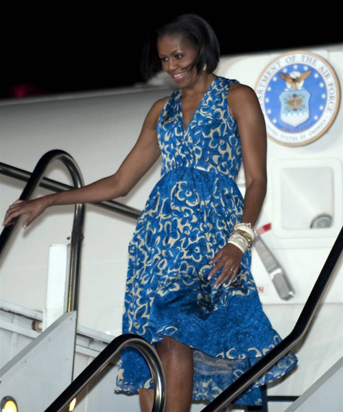 Мишель Обама в легком платье от Tracy Reese выходит из самолета 13 апреля 2010 года в Международном аэропорту имени Бенито Хуареса в Мехико. Это ее первый самостоятельный официальный зарубежный визит как первой леди США.