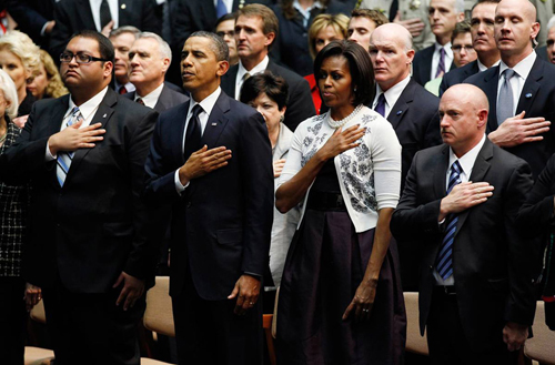 На траурных мероприятиях в Тусоне Мишель Обама присутствовала в темно-фиолетовой юбке и жакете от L'Wren Scott. На снимке: слева от президента США Барака Обамы стоит интерн Даниэль Эрнандес. Даниэль Эрнандес имеет квалификацию помощника медбрата. Сразу после покушения он оказывал экстренную помощь раненой Габриэль Гиффордс, что, возможно, спасло ей жизнь. Справа от Мишель Обамы стоит американский астронавт Марк Келли, муж Габриэль Гиффордс.
