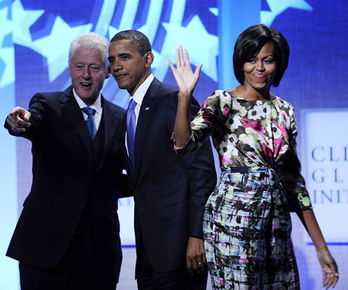 23 сентября 2010 года. Мишель Обама приветствует публику на ежегодном собрании фонда Clinton Global Initiative, который был основан в 2005 году президентом Биллом Клинтоном. Для этого события первая леди выбрала платье от модного дома Moschino.