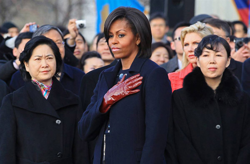 Для церемонии прибытия председателя КНР Ху Цзиньтао в США с государственным визитом 19 января 2011 Мишель Обама выбрала атласное платье, темно-синее пальто и темно-красные перчатки.