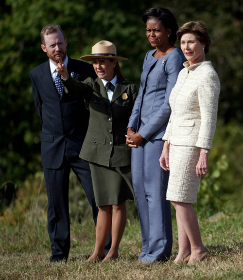 Первая леди Мишель Обама и бывшая первая леди Лора Буш осматривают место крушения рейса 93 в Шанксвилле, штат Пенсильвания, 11 сентября 2010. Мишель Обама одета в шелковый костюм от Narciso Rodriguez. Rodriguez всегда был горячим сторонником Барака Обамы и поддерживал его во время избирательной кампании.