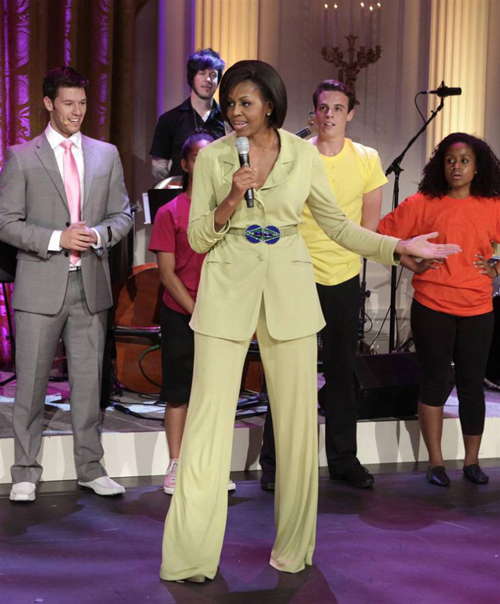Для встречи со студентами танцевального отделения школы искусств Duke Ellington School of the Arts Мишель Обама выбрала элегантный брючный костюм свободного покроя и оригинальный пояс от Erickson Beamon.