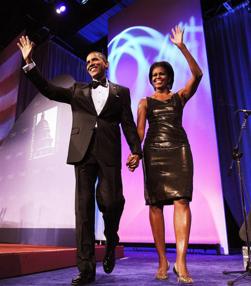Для присутствия на церемонии награждения, которую каждый год проводит организация Congressional Hispanic Caucus Institute, Мишель Обама выбрала платье от Moschino темного бронзового цвета.