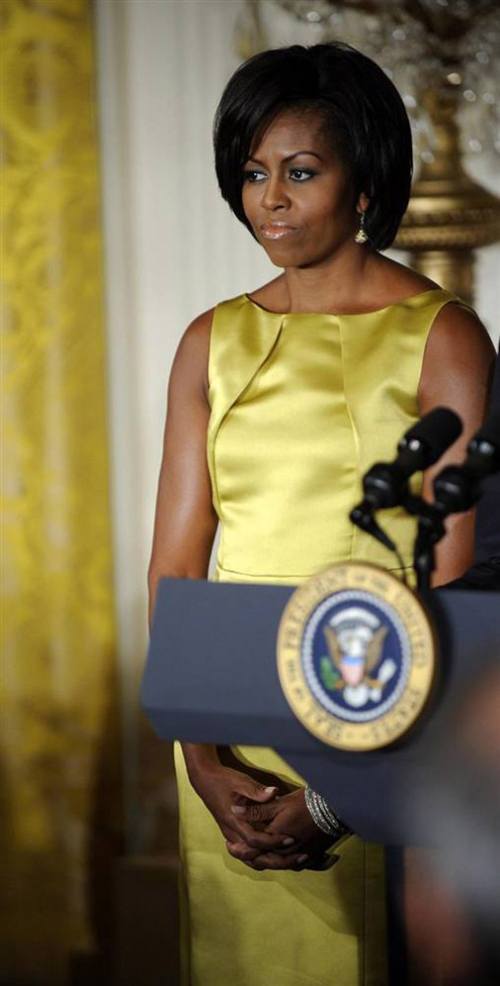 Мишель Обама на приеме дипломатического корпуса. Для этого официального приема первая леди выбрала желтое атласное платье от своего любимого дизайнера Джейсона Ву. На балу в честь инаугурации президента США Барака Обамы на ней было белое платье тоже от дизайнера Джейсона Ву.