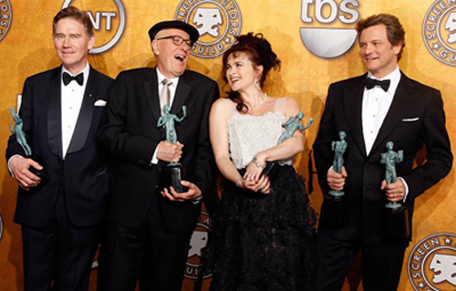Американская гильдия киноактеров (Screen Actor Guild Award) назвала историческую драму «Король говорит!» (The King's Speech) Тома Хупера лучшим фильмом года по мастерству актерского состава. На фото: Актерский состав фильма Энтони Эндрюс, Джеффри Раш, Хелена Бонэм Картер и Колин Ферт позируют со статуэтками.