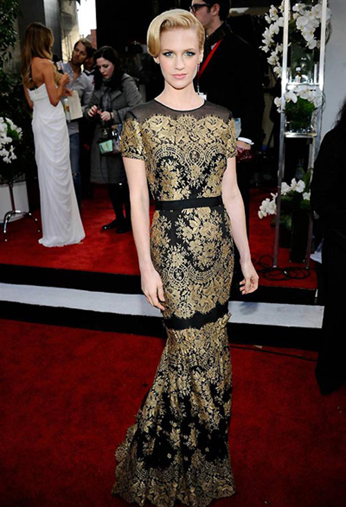 Актриса Джануари Джонс из сериала «Безумцы» в золотистом ажурном платье от Carolina Herrera.