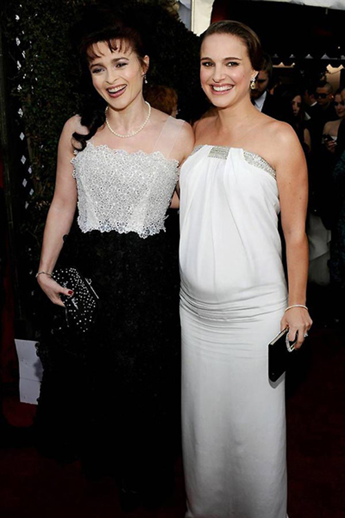 Хелена Бонэм Картер и беременная Натали Портман перед началом церемонии. Картер была номинирована за ее роль королевы в фильме «Король говорит!», а Портман - за роль невротической балерины Нины из «Черного лебедя». В вечер церемонии Портман надела вечернее платье от Azzaro и ювелирные украшения общей стоимостью два миллиона долларов.
