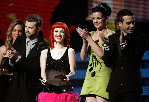 Актриса сериала «Морская полиция: Cпецотдел» Поли Перретт (вторая справа) и группа «Paramore» вручают награду за лучший рок-альбом, которую получила группа «Muse» (альбом «The Resistance»).