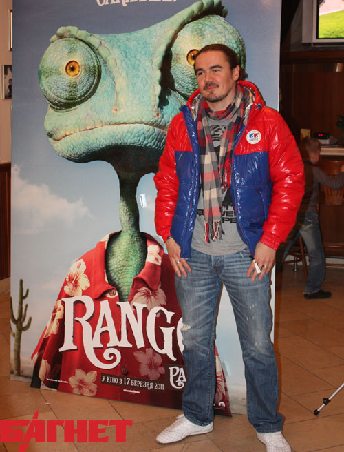 Сегодня в Киеве состоялась долгожданная премьера мультфильма «Ранго», главную роль в котором сыграл Джонни Депп. Как уже писал «БАГНЕТ» в украинском варианте хамелеон по имени Ранго говорит голосом одного из солистов группы «ТНМК», Фагота (Олег Михалюта), который, конечно же стал самым ожидаемым зрителем в зале «Кiнопалаца». Олег появился в компании друзей, в хорошем расположении духа, сделал несколько фото возле своего персонажа, сфотографировался с поклонниками, поделился с журналистами впечатлениями о проделанной работе и скрылся в зале. «Мне разу предложили попробоваться на озвучку Ранго. Когда я пришел на кастинг, меня записали и в числе остальных и отправили на утверждение в Голливуд. Уже там, было принято решение утвердить на эту роль меня. Также было и с «Пиратами Карибского моря», где я также озвучивал Джонни Деппа. Не знаю почему так происходит. Наверное, интонации у нас с ним похожие, а быть может я просто ловлю состояние Деппа в таких шизофренических фильмах» - рассказал «БАГНЕТу» Фагот.