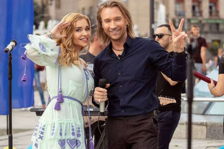 На шоу артист появился вместе с бэк-вокалисткой Таюне, которую считают его женой. В центре Киева украинская исполнительница блистала в полупрозрачном платье бирюзового и сиреневого цветов.