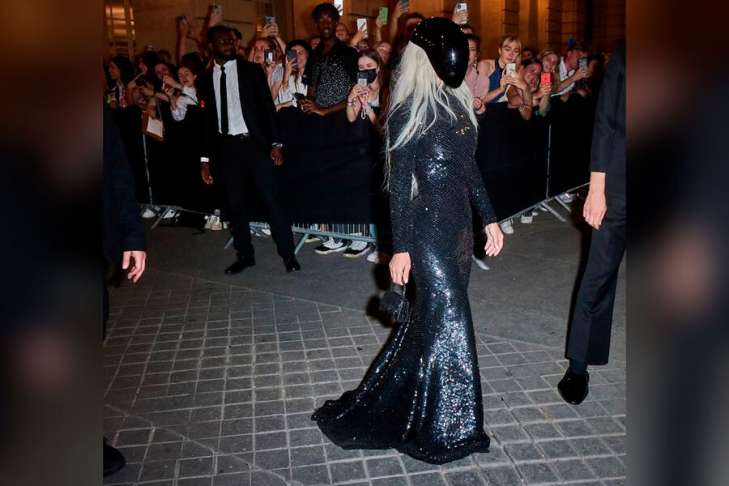 Фотографы сняли звезду реалити-шоу на выходе из парижского отеля Hôtel de la Marine в кутюрной коллекции бренда во время Недели высокой моды в Париже. Она надела платье в пайетках и черную маску на лицо, напоминающую шлем мотоциклиста. После звезда поделилась снимком в Instagram.