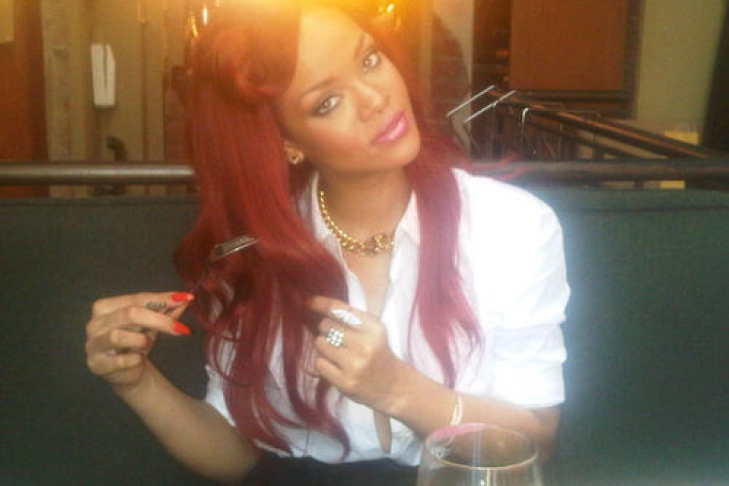 Певица Рианна (Rihanna) расчесывает свои выкрашенные в красный цвет волосы вилкой. Это видно на фото которое она разместила на своей страничке в Твиттере. Видимо певица считает русалочкой.
