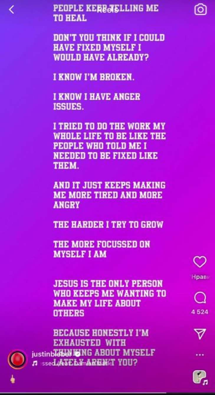 На тлі постійно циркулюючих чуток про розлучення з Хейлі Бібер, банкрутство, зв'язки з P. Diddy, продаж Rhode через борги співака, всі пости Бібера у мережі викликають яскравий відгук. Фанати закликають допомогти їхньому кумиру дитинства, а його звернутися до нарколога.