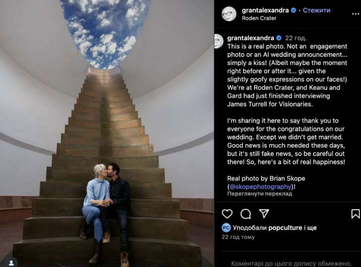 Александра разместила в своем Instagram фото, где она целуется с Киану на лестнице возле Восточного портала кратера Роден – артпространства в Аризоне. В подписи к фотографии она пояснила, что это не свадебный снимок.