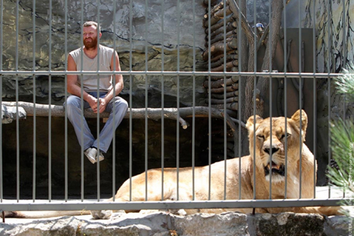 40-летний художник и владелец небольшого зверинца в городке Васильевка (Запорожская область) Александр Пылышенко 2 августа начал эксперимент по совместному пребыванию в одной клетке с девятилетней львицей Катей, пишет в своем ЖЖ drugoi.