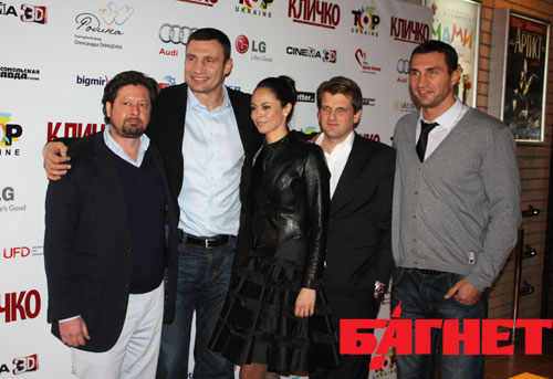 Самыми ожидаемыми гостями в зале и на красной дорожке были, конечно же, сами братья Кличко. И они появились, правда, самыми последними, когда зычный женский голос призвал из динамиков «киевлян и гостей столицы» проследовать в зал и занять свои места согласно купленным (ну или на халяву отхваченным) билетам. Компанию им составила супруга Виталия Кличко, Наталья, а также режиссер картины и ее продюсер.