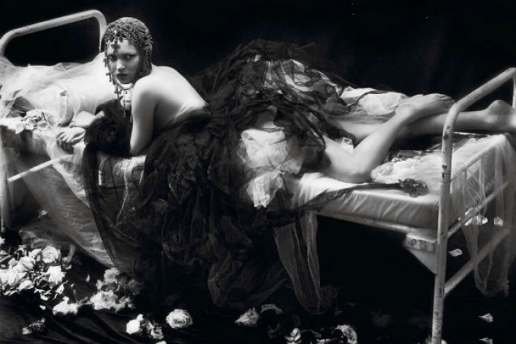 Кейт Мосс на страницах журнала похожа на готическую принцессу из заброшенного замка: темные роскошные наряды, замысловатые головные уборы и накидки, прозрачное черное кружево, темная помада и пронзительные взгляды, полные томной тоски и загадочной печали. В похожем наряде мы видели Кейт Мосс в журнаде LOVE. В восьмом выпуске журнала, посвященном теме A Costume Drama, британская модель примерила разнообразные драматические образы. Над фотосессией работал фотограф Тим Уокер (Tim Walker).