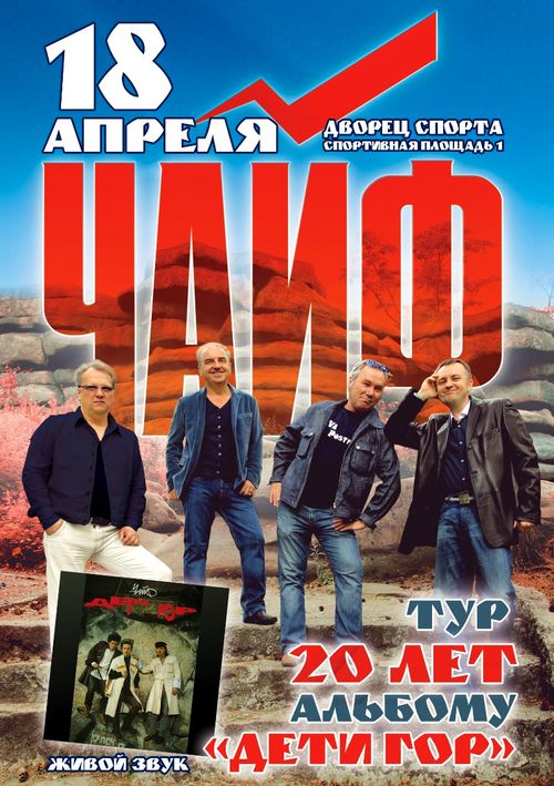 18 апреля, на сцене столичного «Дворца спорта», группа исполнит все песни из альбома «Дети гор» в том же порядке, в котором они расположены на этой пластинке. Также, ЧАЙФ сыграет композиции из нового альбома, который группа планирует выпустить в ближайшее время. Само собой не обойдется и без других, всеми любимых хитов.