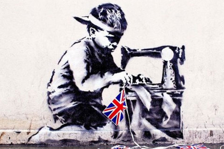 На граффити изображен мальчик за швейной машинкой, который делает гирлянду из британских флагов. Изначально рисунок был сделан на стене одного из лондонских магазинов. Через некоторое время неизвестные злоумышленники украли граффити вместе с фрагментом кладки.