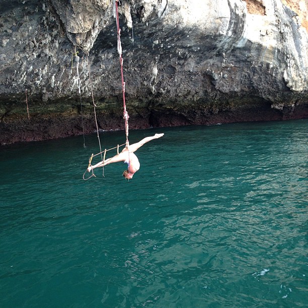 Шпагат в исполнении звезды вниз головой в подвешенном состоянии над морем на фоне скал - зрелище завораживающее.