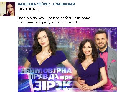 На официальной страницы Надежды Мейхер в соцсети появилось сообщение о том, что певица и телезвезда больше не будет вести программу «Невероятная правда о звездах»(СТБ). Соведущий Надежды Григорий Решетник тоже остался без работы, сообщает ДеПо.