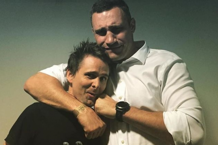 Вокалист британской поп-рок группы Muse Мэтью Беллами выложил на страницу в Facebook фотографию с бывшим чемпионом мира по боксу в супертяжелом весе, действующим киевским мэром Виталием Кличко, который в шутку целится кулаком в лицо музыканта, пишет ua.today.