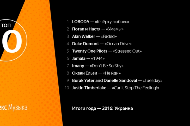 Во вторник, 13 декабря, интернет-сервис Яндекс.Музыка посчитал, какие песни чаще всего слушали пользователи из Украины в 2016 году, сообщают Ukranews.
