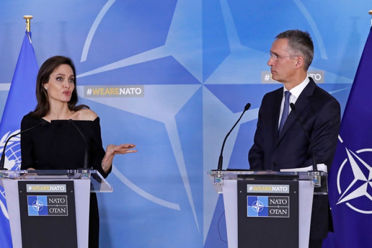 Американская актриса, спецпосланник управления верховного комиссара ООН по делам беженцев Анджелина Джоли посетила штаб-квартиру НАТО в Брюсселе, где встретилась с генеральным секретарем этой организации Йенсом Столтенбергом, сообщает Daily Mail.