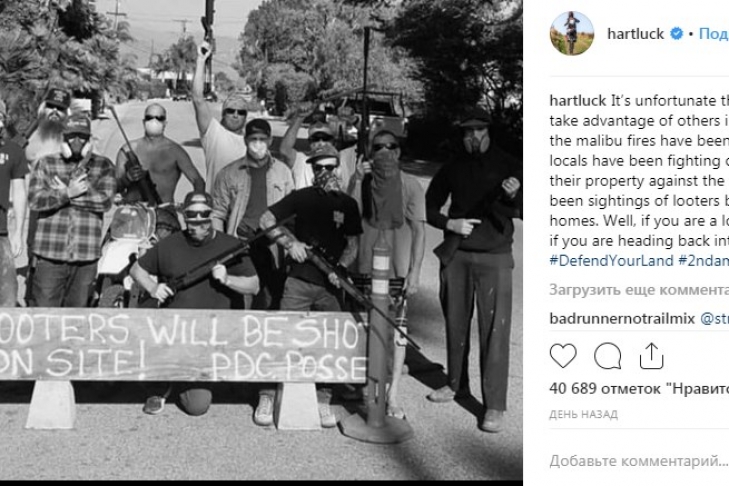 Харт разместил свое предупреждение в Instagram. Он выложил фото людей в масках, с оружием и знаком "Мародеры будут расстреляны на месте". "Если ты мародер, подумай дважды, прежде чем вернуться в Малибу", - подписал снимок Кэри Харт, информирует "Багнет".
